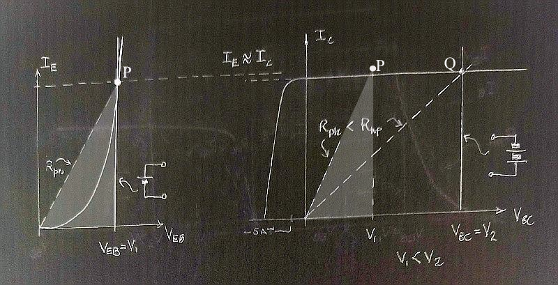 As a matter of fact, the absence of resistors is essential to explain why (output voltage V2 = VBC) > (input voltage V1 = VEB) is consistent with the assumption Rnp > Rpn and can be illustrated in a single picture