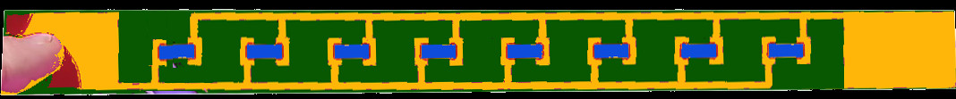 Ok, so each LED has one leg on the bottom "bus" and one on the top "bus", progressing from left to right the first led has a short bottom trace and a long top trace, and the last led has a short top trace and a long bottom trace. The knee-jerk is "yeah, they balance out so all the leds have the same total resistance in series, should be equal brightness assuming matched leds right". But the big brightness drop off towards the middle says otherwise.