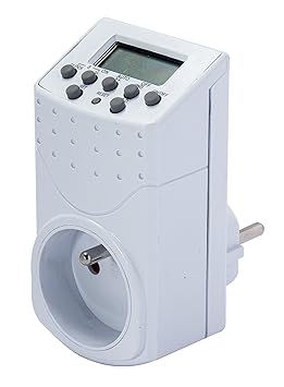 The timer is a simple mains powered digital timer that I bought for around 7 euros, I’m sure there are many local equivalents. I can program 20 events, each with {day, start time, stop time}, and “day” can be any single day, or each day, or M W F, or T T S, or MTWTF, or SS