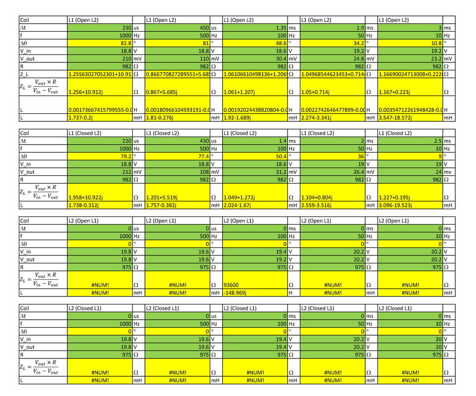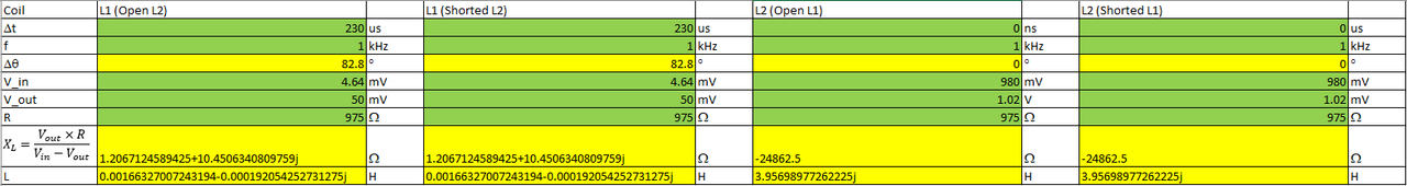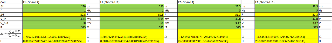 L1 and L2 are not pure inductances, but each has a series resistance. If you calculate the complex impedance, the imaginary term represents the inductive reactance. An inductance calculated from that will be real and the resistance will be imaginary. The reactance of an inductor should be positive, while a capacitive reactance is negative. I can't audit your spreadsheet remotely, but there is a sign error somewhere.