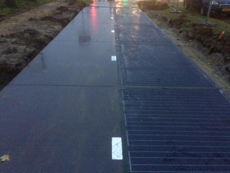 Ok it is not slippery, but see that little strip of ground between the cycle path and the walkway? You could have placed poles there 3m high, with regular solar panels on it, which probably cost 10% of the design cost of these embedded panels. No shading from cycles travelling on them, no need to sweep every day to actually get an output from all the amorphous cells ( and they are bloody big single cells as well to try to compensate a little, but still if half is shaded then the whole thing only gives half power) and they will still work in snow ( Nl does get it, Ma V moaned about taking Dibbis walkies in the snow) until you clear it with a broom. I think a mechanical snow plough will destroy those panels in no time.