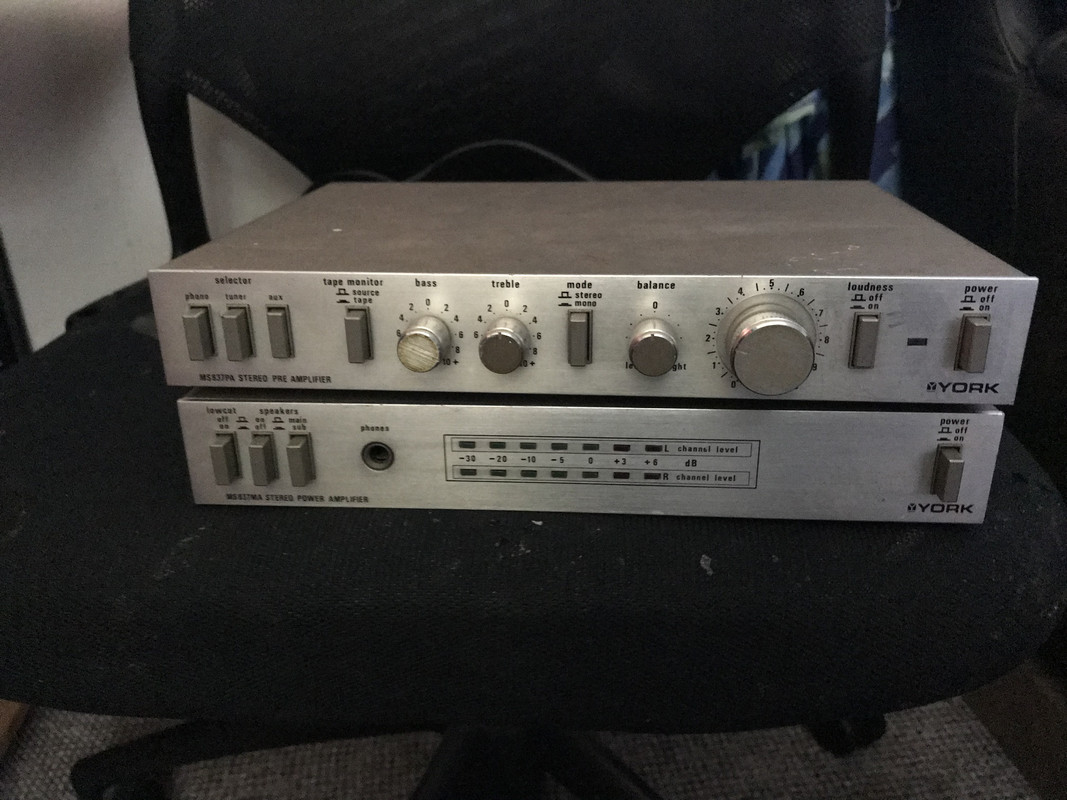 Anyone ever come across YORK before? I just got this nice little YORK pre/power combo. Says made in japan on the backs, had a quick look inside them, all japanese components, ALPS twisties, Oscar caps. The power amp has some sort of all in one for output power, all discrete components otherwise. Same for the pre amp, all discrete, nice japanese ALPS twisties. The power amp is heavy, has a big flat transformer in it, lots of fuses too.