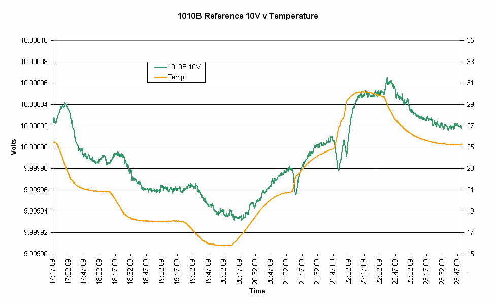 I've worked on that project slowly over half a year now and at last the reference is boxed and working quite well. It is built on a bit of a stripboard and as I only have enough bits to build one more, I am not planning to make a pcb for it. Most components are from eBay, the main exception is Pomona CuTe connectors. The reference is very simple, containing the LT1021CMH chip, a 20K multi-turn pot, few resistors and diodes for an additional temperature compensation (without it the tempco was over 10ppm/C, now it is around 1ppm/C), a reverse polarity protection diode on the P/S connector, a P/S capacitor, an LED, a 3-position switch and a nice VBF 10K/1.111111K divider in a hermetic case. This unit can provide 10V, 1V, 10K and 1K reference values with a reasonable accuracy and (hopefully) a decent long-term stability (better than 50ppm looks about right). The switch connects the output terminals to the voltage reference in one position, disconnects it in the middle and shorts the terminals in the third position. The divider is wired permanently to the output terminals providing 1V reverence from 10V output, so with the voltage reference disconnected, the resistance between two red terminals is either 10K or 1K. I will now measure the voltage and resistance values over a period of time (probably a couple of weeks) and my plan is to use this unit as a travelling reference. There is a space left for an output buffer to give the reference better load capabilities and a better short-circuit protection (right now it will survive a short, but most likely would suffer a hysteresis shift after that) so I will install it as a next step.