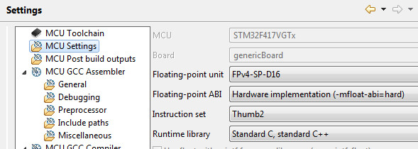 I can specify a compiler command like option e.g. -mfloat-abi=softfp -mfpu=fpv4-sp-d16 but it "doesn't go in" because the global project config overrides it.
