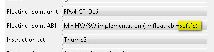 On the command line (GCC) I see -mfpu=fpv4-sp-d16 -mfloat-abi=hard and this is even if I put -mfloat-abi=softfp in the .c file properties / compiler flags. Well someone did say this lib does weird float stuff. The doc says nothing about it.