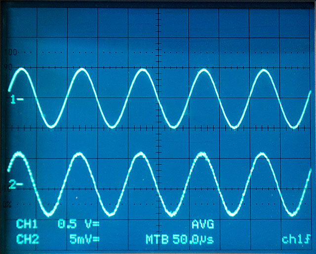 Channel 2 is the input signal at 10mV p-p and channel one the output at 1V p-p. Bandwidth could be better - about 100kHz - but I don't really need any more to look at 50Hz ripple. The lower (input) trace is a little noisy but that's the 'scope input amp.