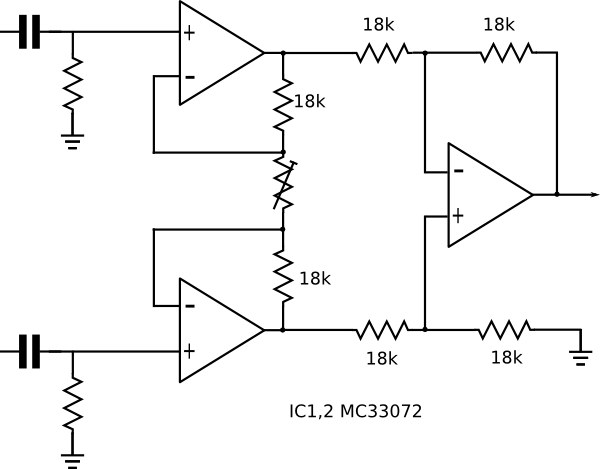 The left op-amp is used for the two buffers and the right for the difference amplifier. I used MC33072's because I had a few lying around. The 18k resistors are 1% metal film but hand picked for a group which are all 0.1% or better. The disadvantage of this configuration is that the CMRR is dependant on resistor matching which is why most of the time one would pick up a custom instrumentation amp IC rather than trying to build it from discreet components.