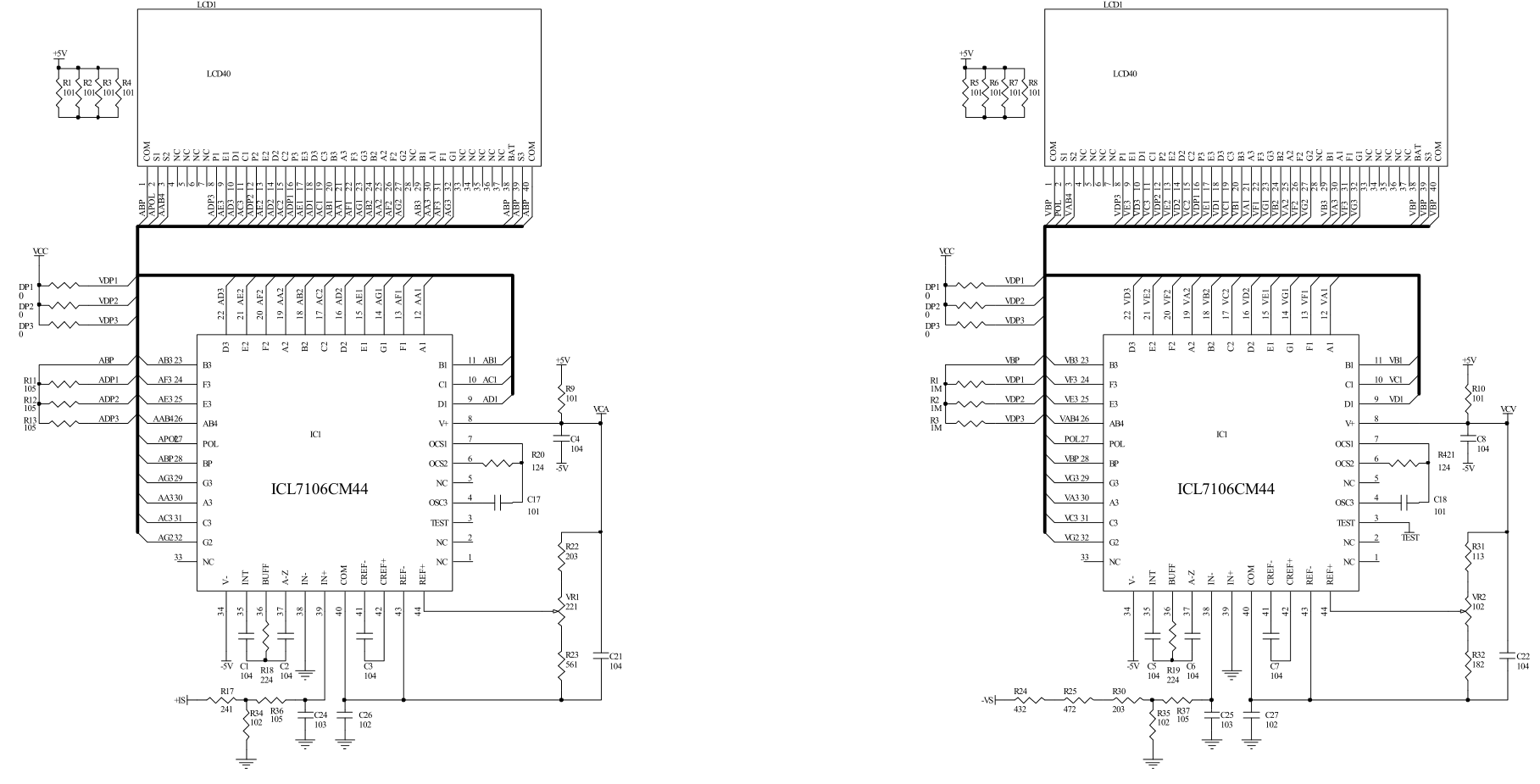 multimeter chips (one for voltage, one for current) ... icl7106 is with lcd segments , icl7107 is with normal led segment (so you could use 7 segment digits)..