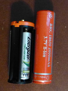 An 18650 compared with the standard AAA battery assembly.