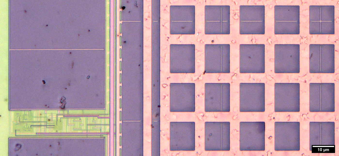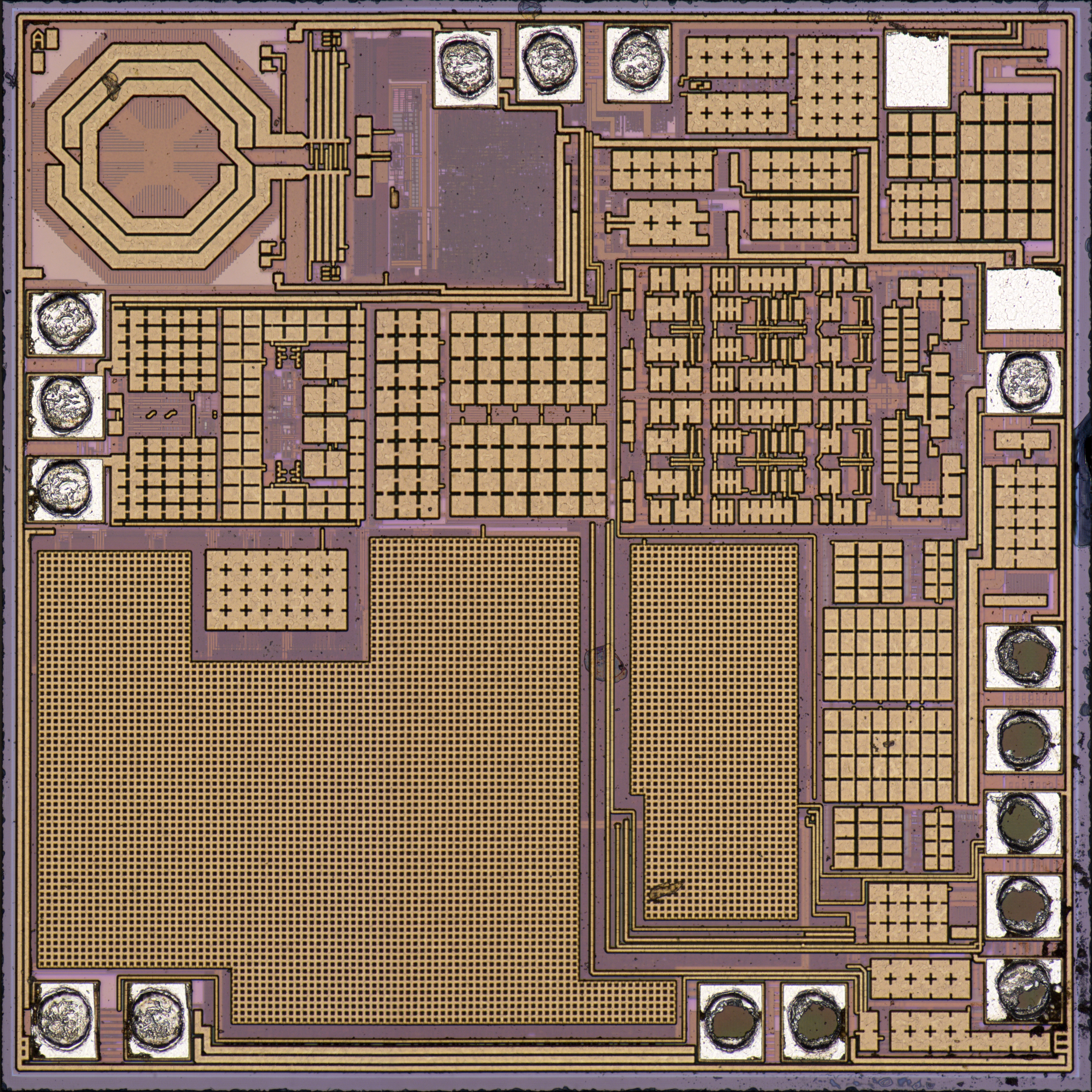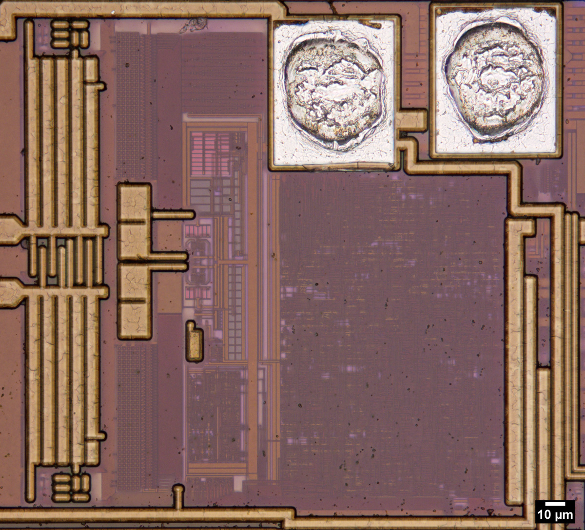 A square is depicted in the metal layer in the lower left corner. These squares are often found on the die. They are probably preparations to make it easier to contact these potentials in case of troubleshooting.