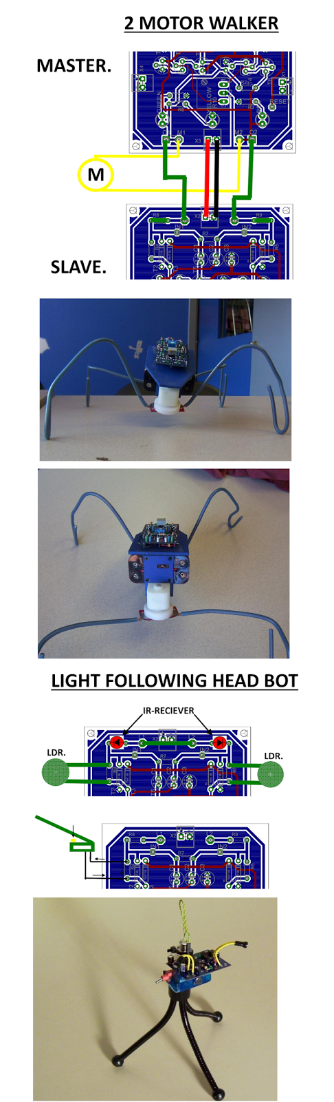 These boards are designed to be cheap, so groups and schools can afford them to teach basic electronics skills, plus you get a robot at the end of it., 100 kits - 100 boards, all the components, 100 motors, 100 battery boxs, Come to around £220. the boards can be used in various ways, you can link them for a master slave config. you can make individual robots that join together, producing different states. another example is using two independent Abcores. this gives the robot two states: turning and forward. Under normal conditions, forward is the least energy state. So the robot will continue forward until a flagellum strikes an obstacle and loads up the motor. It will then reverse the flagellum and go into the turn state. This puts a higher load on the motor and thus, after a few seconds, the Abcore will reverse and resume moving forward.