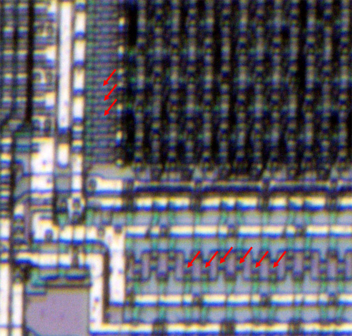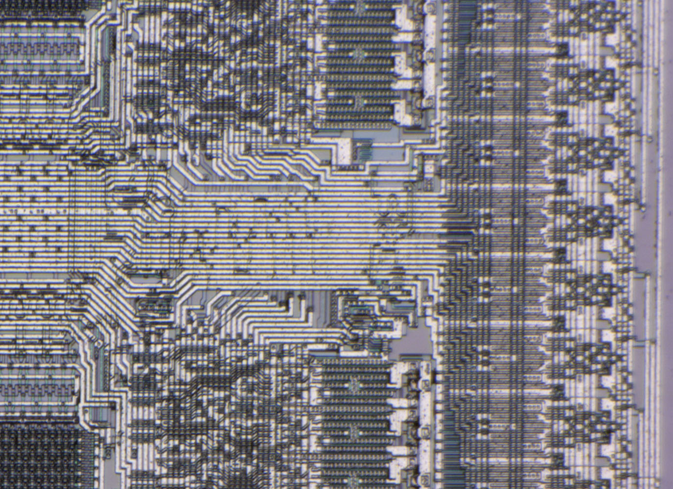 It is interesting that the output amplifiers seem to be bypassed during programming. From the line selected, a line leads directly to the bondpad via a larger structure. This also explains why a low at the output can be used to disconnect the fuse, but in normal operation a high is present at the output when the fuse is disconnected.