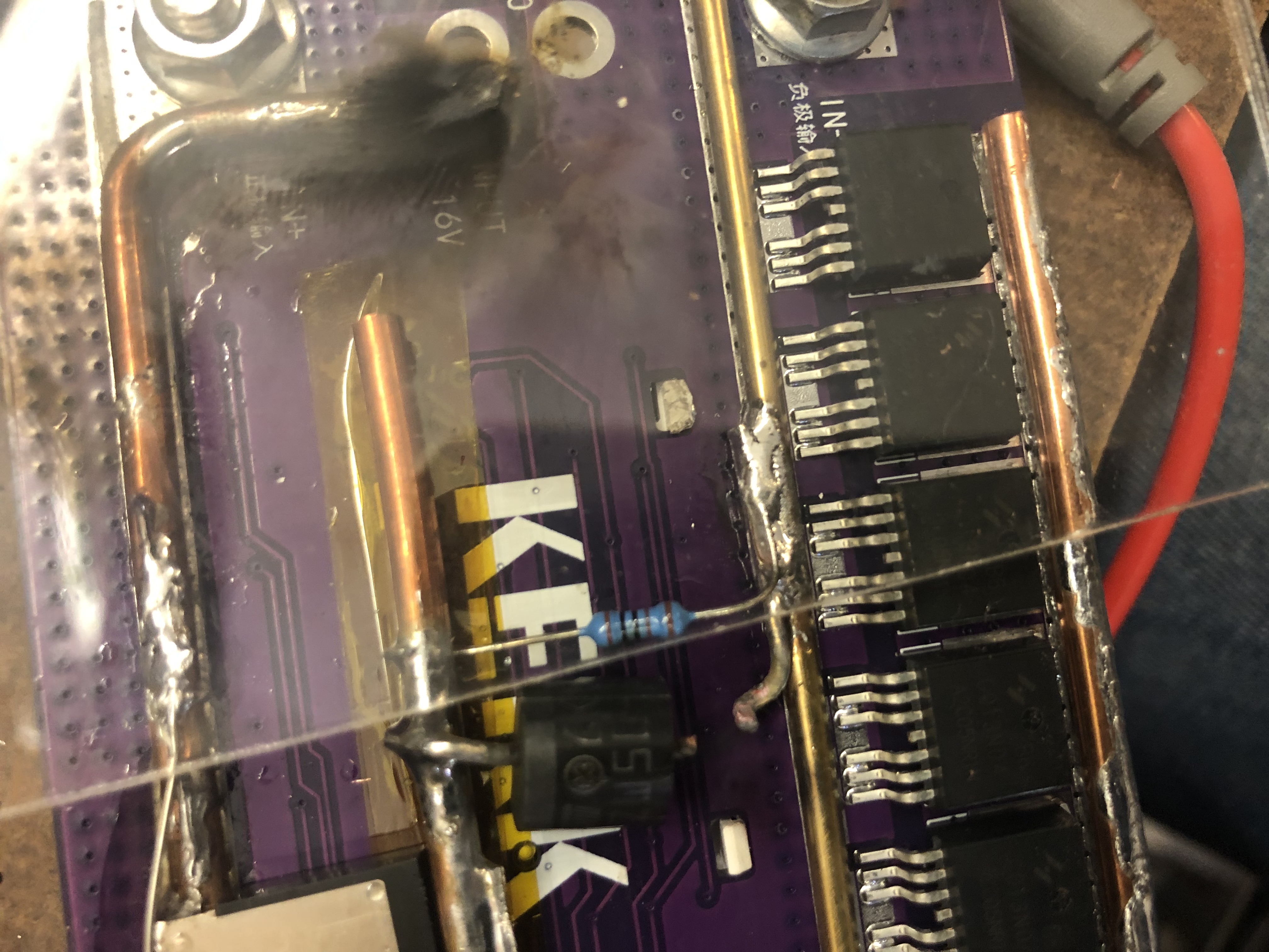 So, mods. Firstly I wanted a location for a flyback diode, and a TVS to prevent avalanching the fets with longer cables. These fets are rated to 1418mJ avalanche, and I have 12 of them, but if I can avoid it entirely that'd be nice. I also wanted to see what I could modify to improve the current handling a bit.