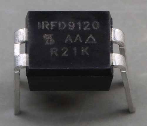 The Siliconix IRFD9120 is a p-channel power MOSFET in a DIP-4 package. The IRFD9120 blocks up to 100V. The current carrying capacity is 1A continuously and 8A peak. The typical resistance is in the range of 0,6Ω. At room temperature 1W can be dissipated. The datasheet also specifies an IRFD9123 with slightly poorer characteristics (60V, 0,8A, 6,4A, 0,8Ω). These are probably two different grades.
