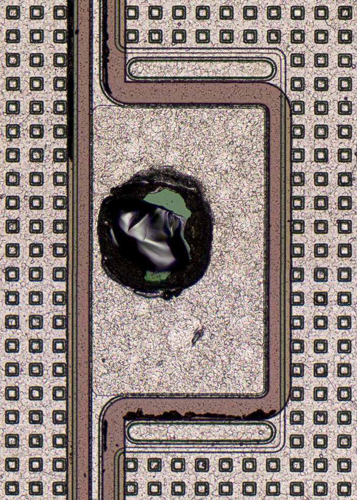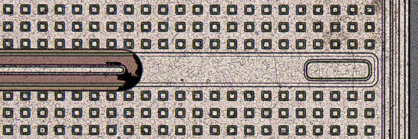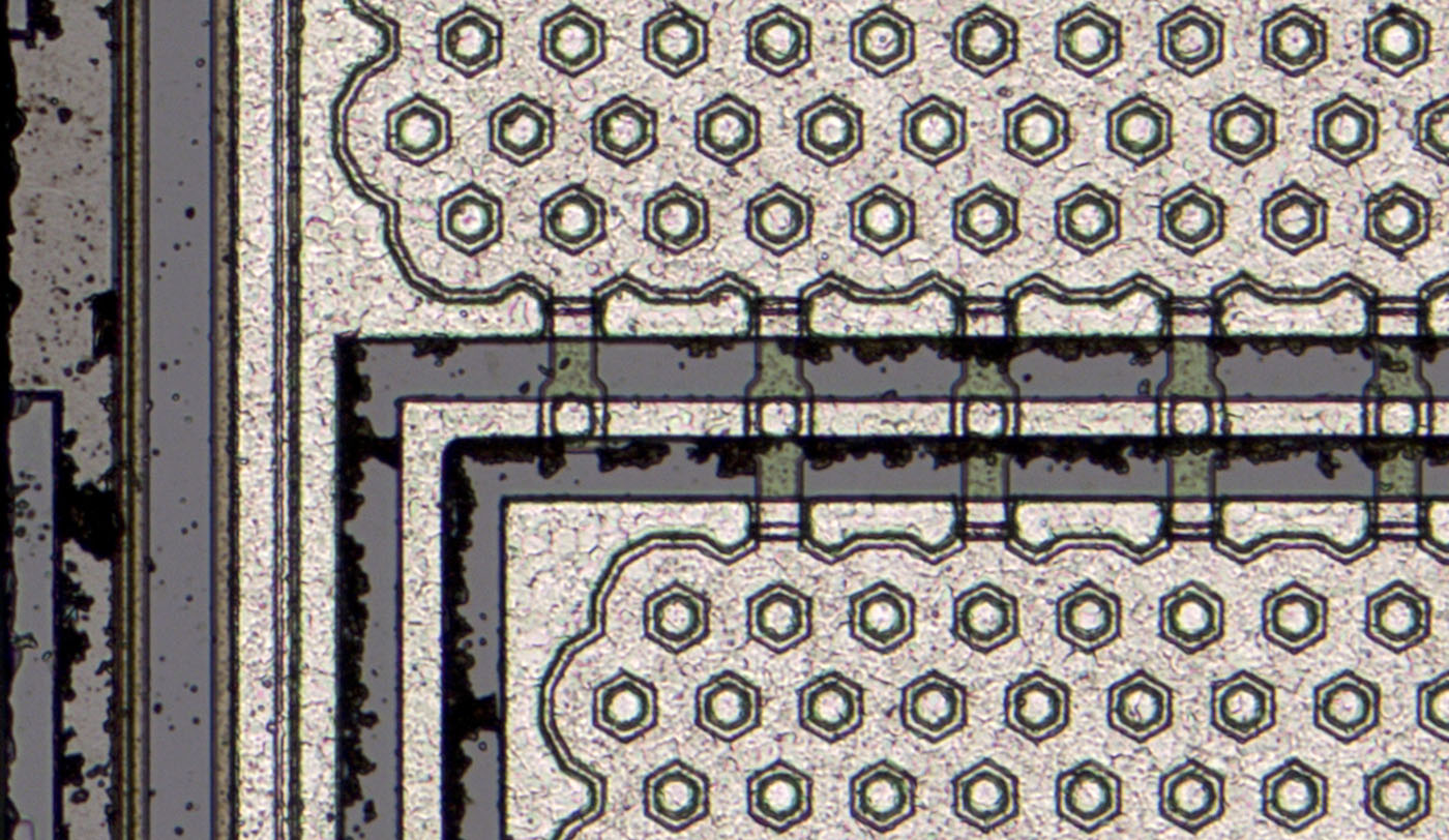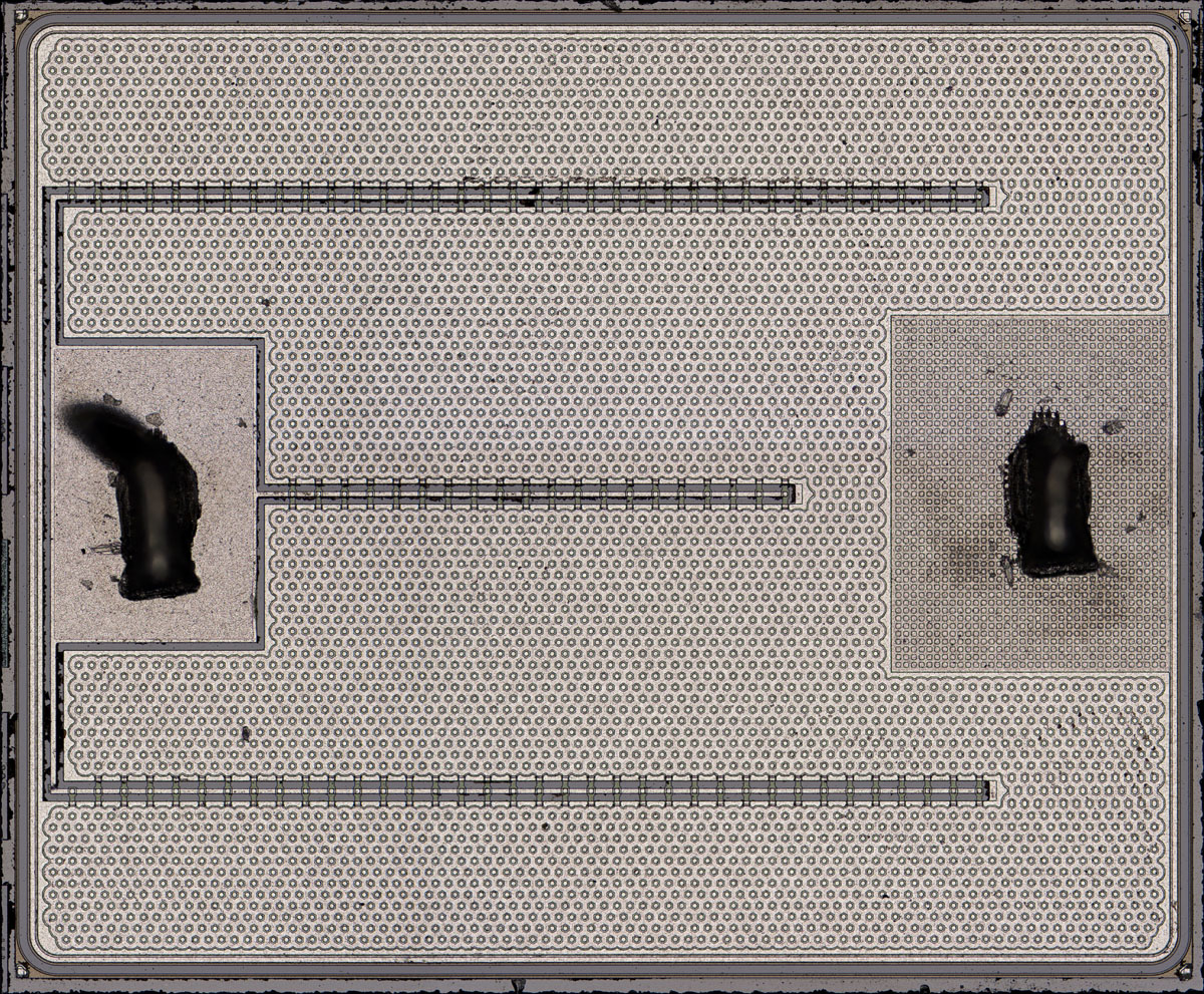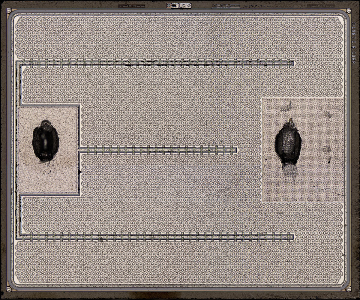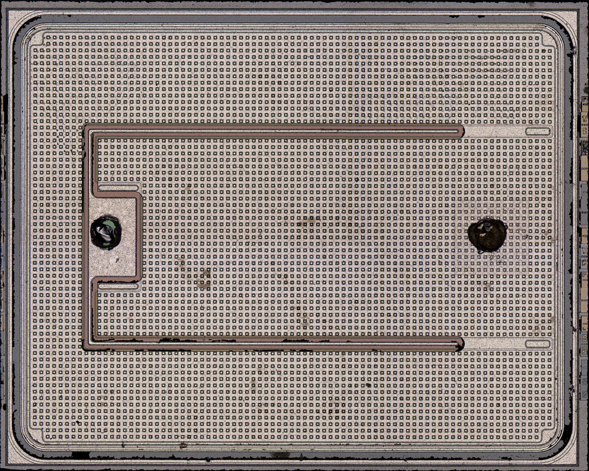 The contacts in the metal layer of the IRFD9120, on the other hand, are round, each surrounded by a hexagonal structure. This must be a third-generation International Rectifier HEXFET. Its design is documented in more detail in the IRC540 (IRCZ34) (