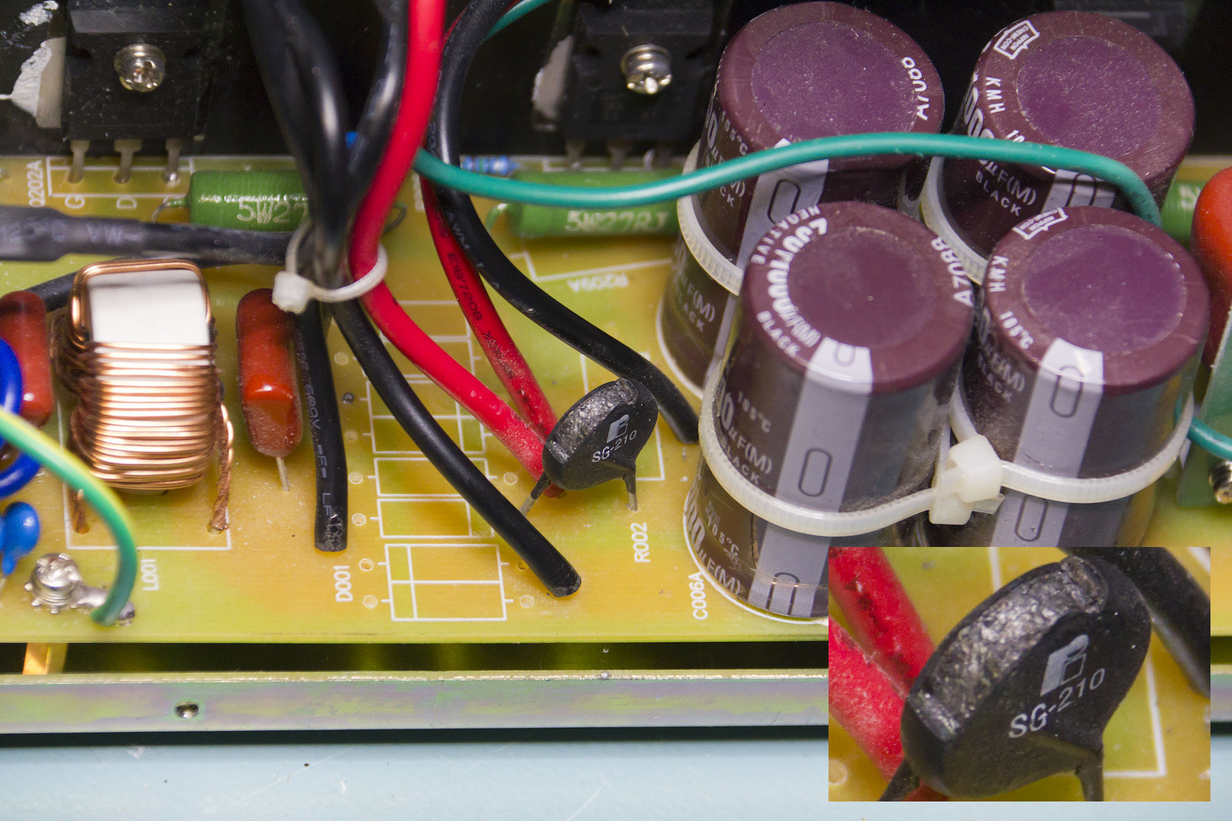 One thing I don't understand is the function of the thyristor SCR001, especially as it is paralleled by quite a low value resistor. In fact this is an SG210 inrush suppressor in the unit I have although the schematic has 27ohms for the 5020 and 20 ohms for the 3040 (at least I think it's 20ohms, it says 10ohms x 2 but doesn't say whether series or parallel). This is supposed to have a cold resistance of 7ohms and a resistance at rated current of 0.2ohms.