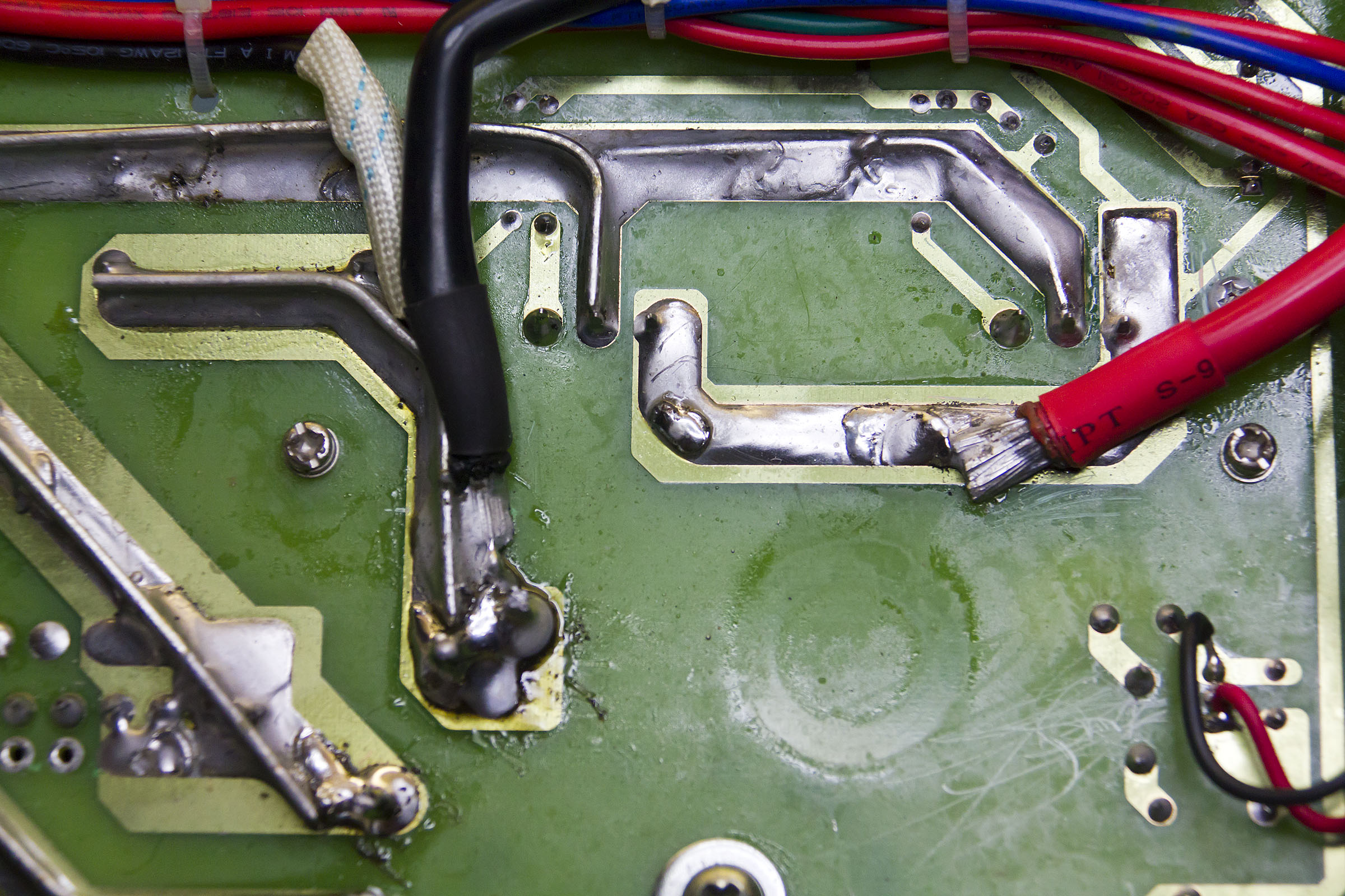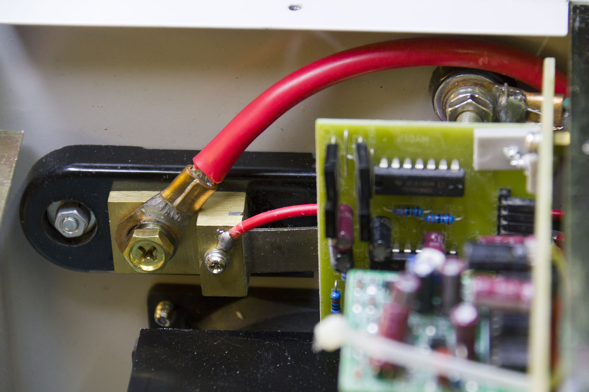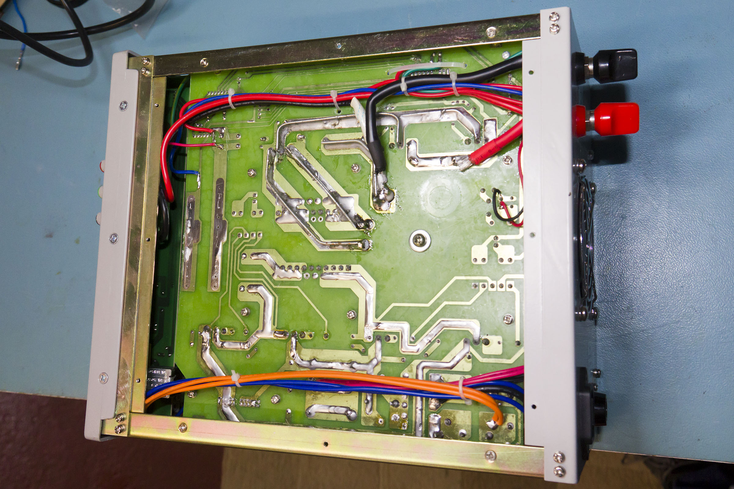 The high current paths are all heavily re-enforced so it should stand up to the max load of 40A with no problems - except, curiously, for the positive output (see photo below). Although this is connected by an 8 AWG cable (good for 75A or so) it isn't soldered all that well to the board, nor is this trace endowed with extra copper. The heavy 8AWG cables run to the terminals on the back, then lighter 12AWG cables run to the front binding posts. This really is another weakness of the design - whilst it's clear that you are supposed to connect high current loads to the rear binding posts there nothing limiting current from the front post as far as I can see - and more than enough capacity to melt the banana sockets
