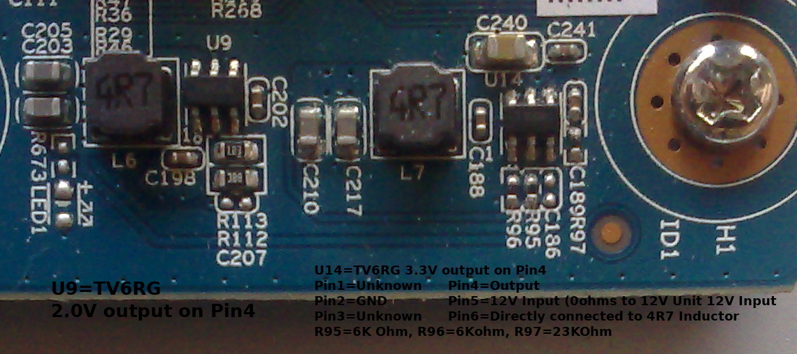 I have a Dahua NVR4116-4KS2/L NVR which runs on 12V. One of the small DC-DC stepdowns got damaged and I need to replace it. I have multiple units so it was quite easy to check another and figure out some of the pinouts. I have included an image here of a good board and it contains the details I have figured out.U14 is the one I need to replace however both in the image are identical, just different resistors I assume to get the different output. Checking various websites with SMD codes, none seem to match what is on these boards - TV6RG.