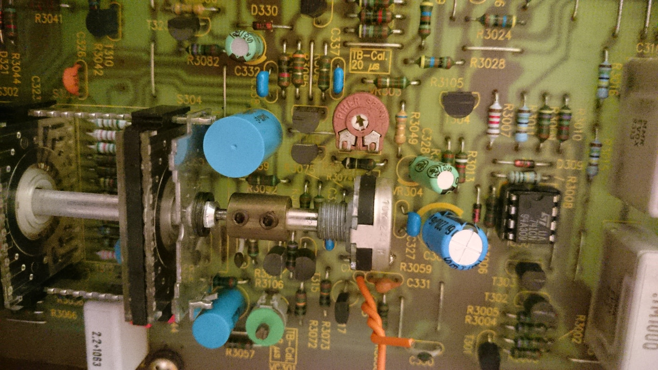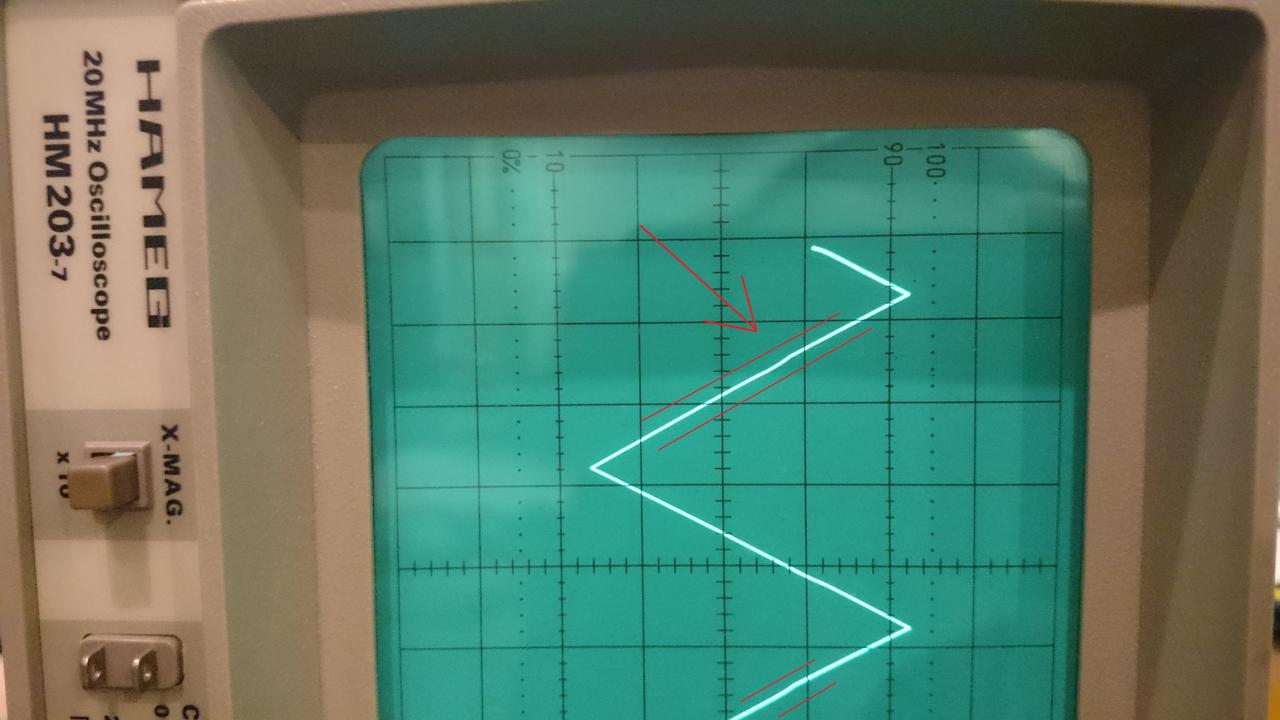 I have a really nice Hameg scope 203-7 (20Mhz) on the bench that I have cleaned up. After fixing the dreaded VAR knobs and checking some solder points and calibrating the Y-Gain, I suddenly have a slightly deformed problem in every second half of the wave.