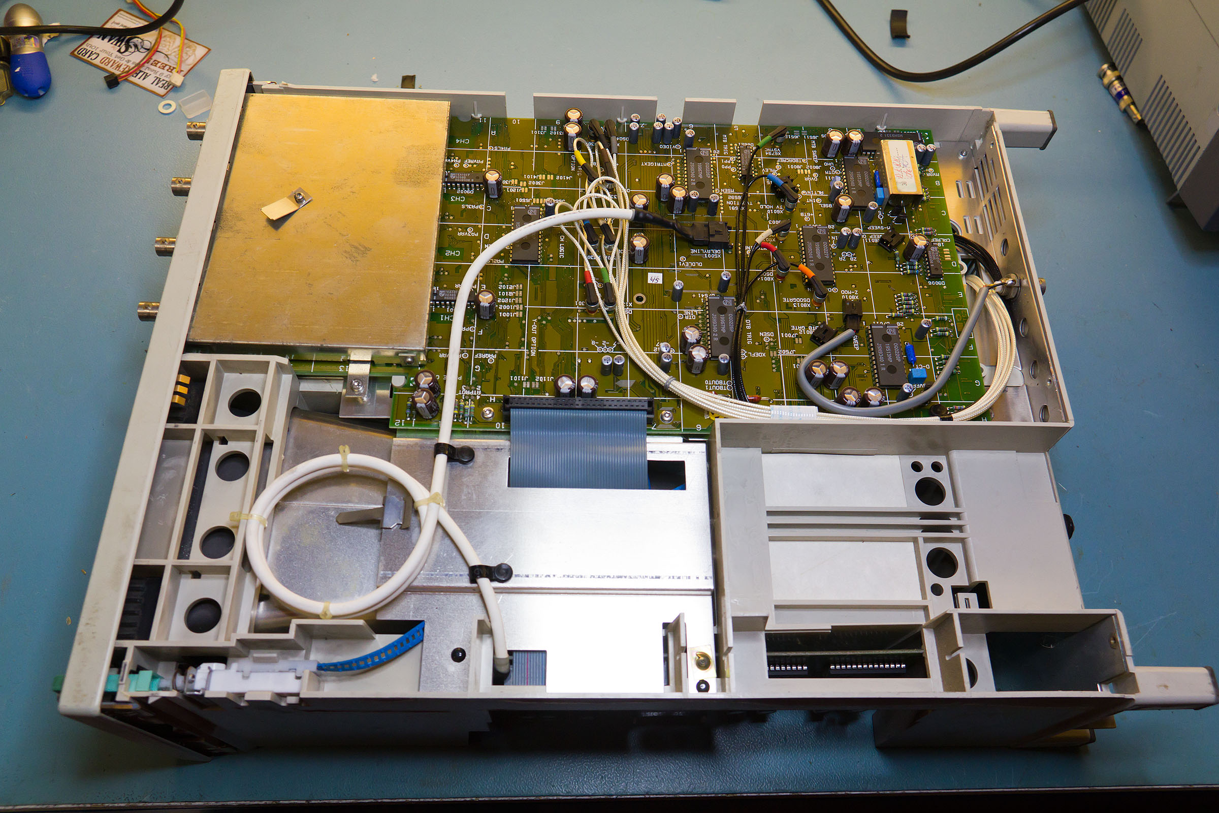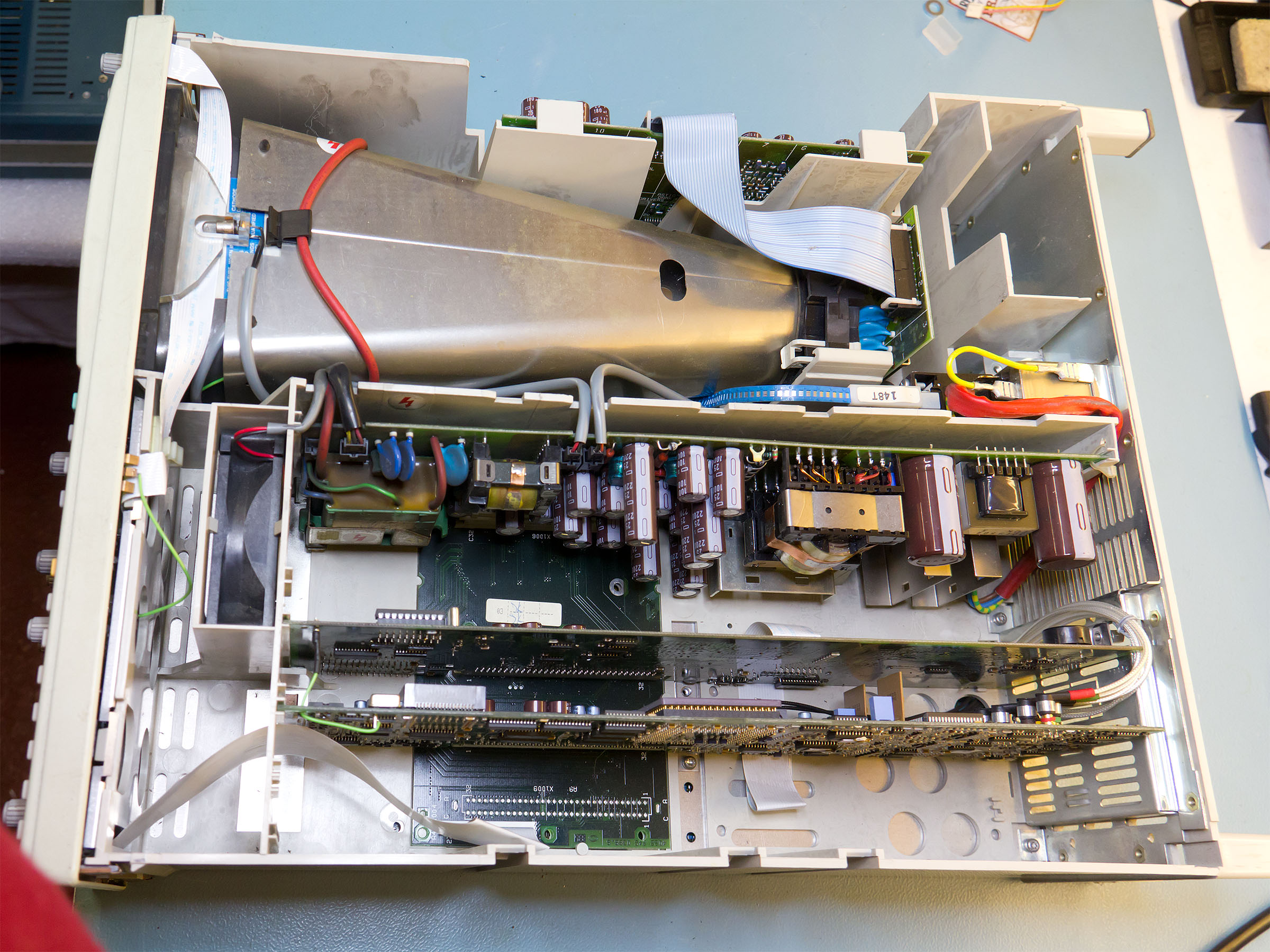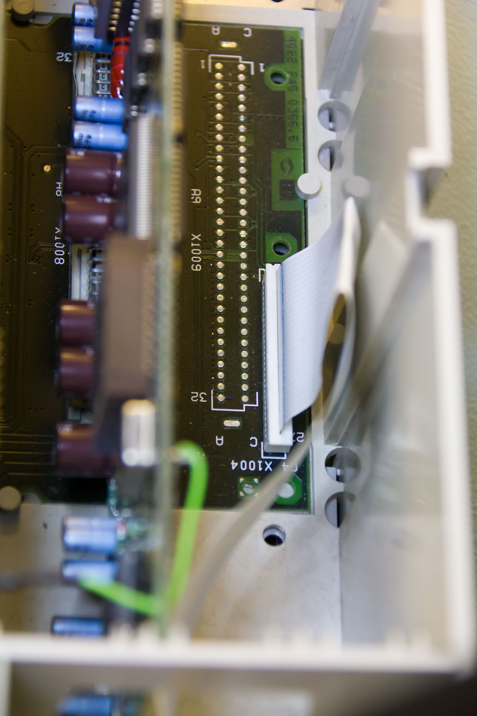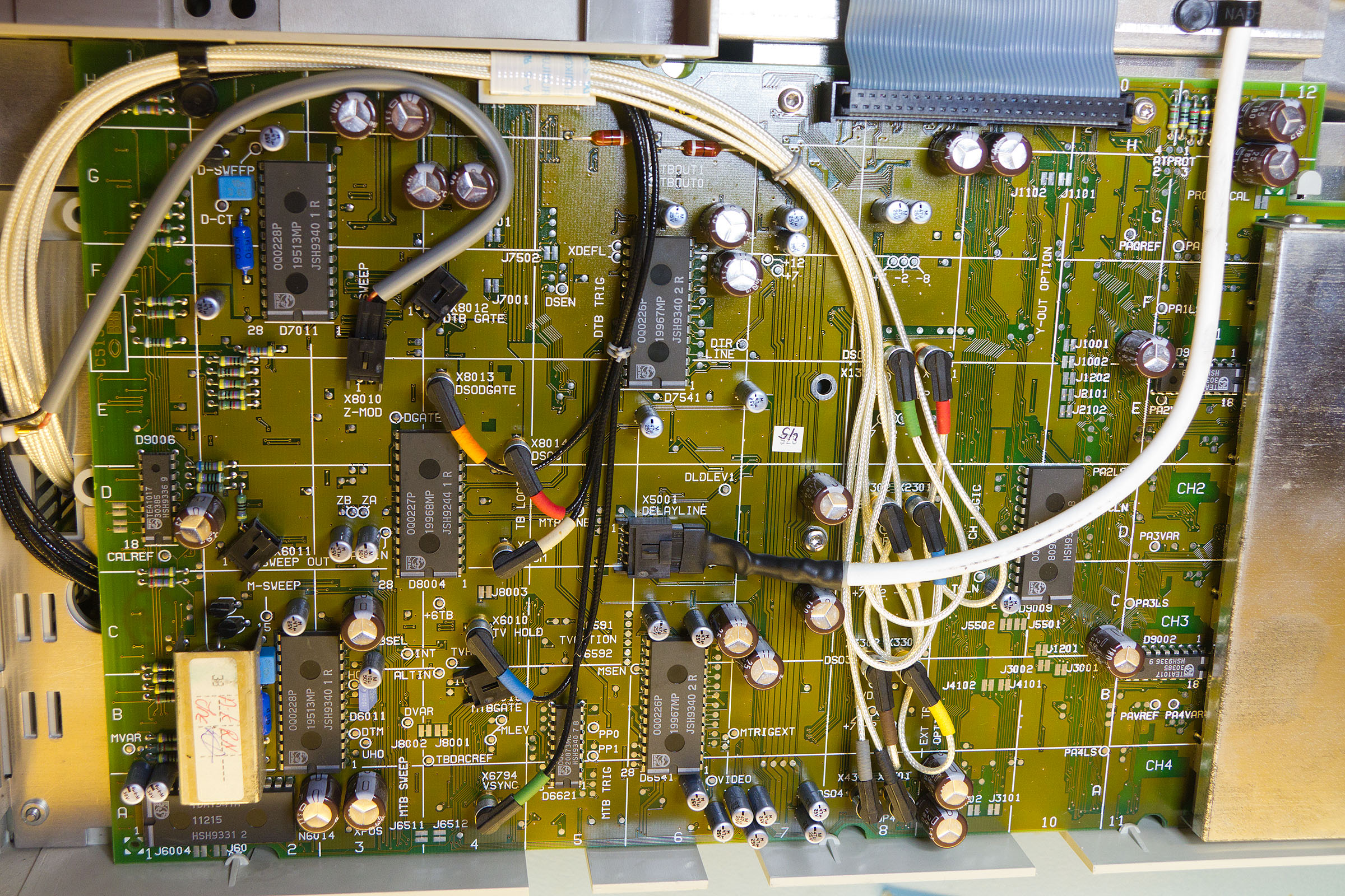 The front panel connector is in a spectacularly awkward place. I've ended up cursing this several times. Worryingly there appears to be provision for a further card in the chassis - I don't know what variant of the 'scope would have that but it would be impossible (rather than merely very difficult) to connect and disconnect the front panel ribbon cable with it in place.