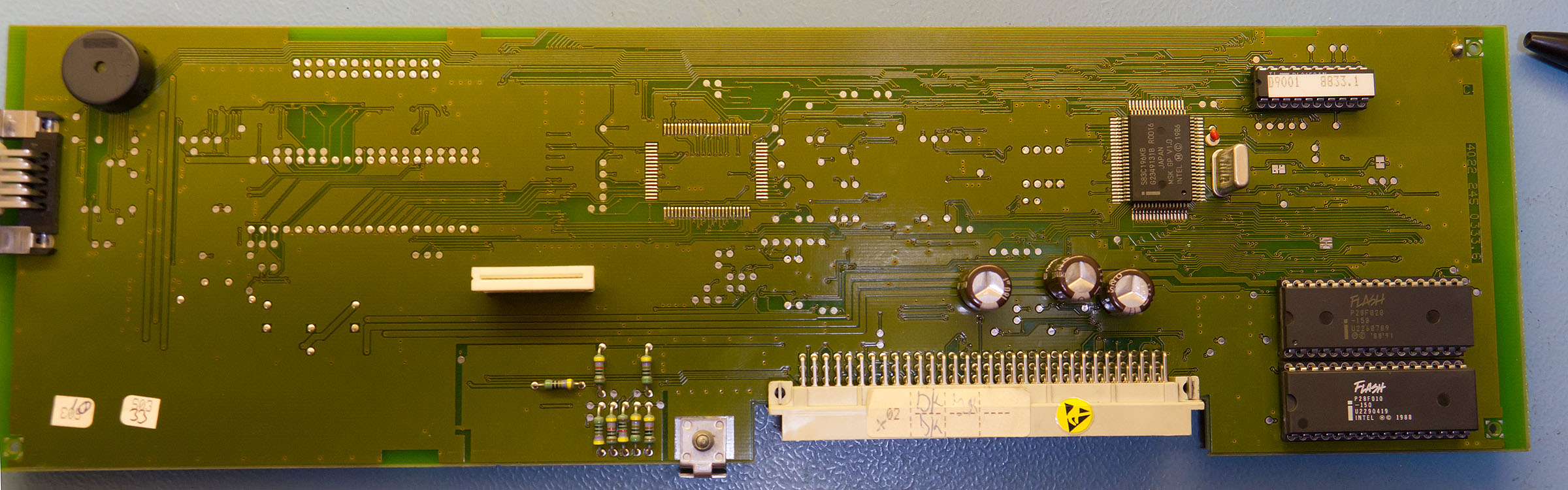 The lowest card in the picture above is the acquisition and data processing card A8 - basically the DSO part of the 'scope plus triggering and text generation. It has several custom chips, two 200Ms/s ADC's and a TMS 320C25 DSP. I'll probably need to have a more detailed look at this card to figure out why I'm not getting any readout text from the 3394.