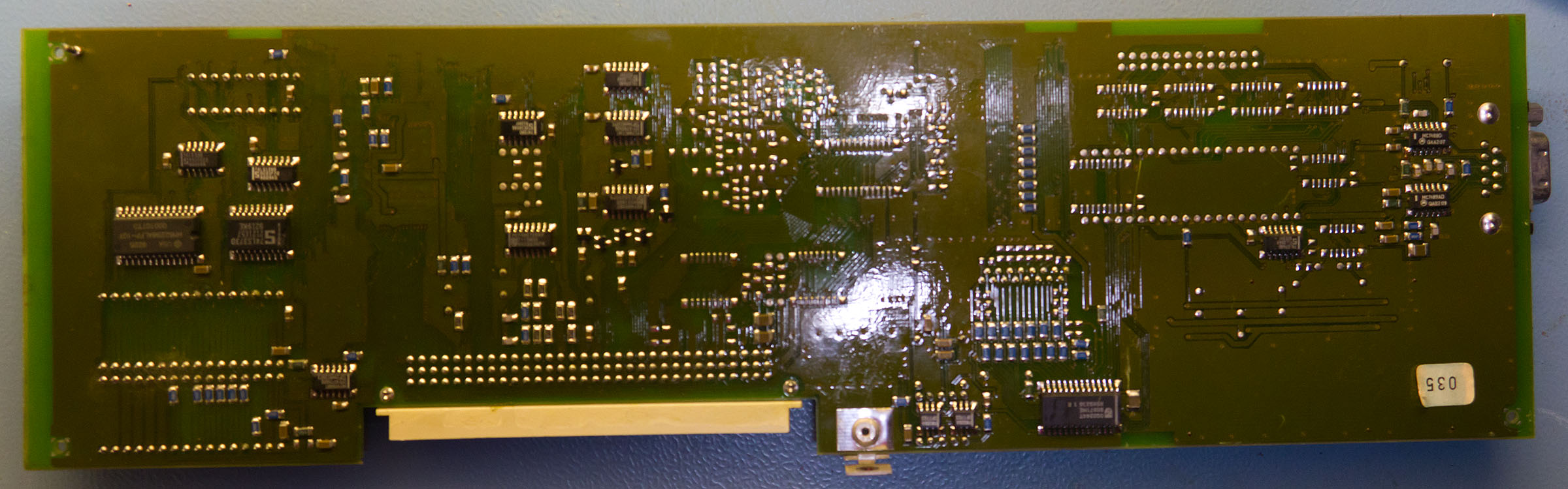 CPU card processor side - there's really very little going on on this card. The main processor is an 80C196 in qfp package which you can see just above/to the right of the three capacitors. There's a GAL used for decode (DIL chip with label) and two flash ROMS. To the left of the board there is the (unpopulated) GPIB option.