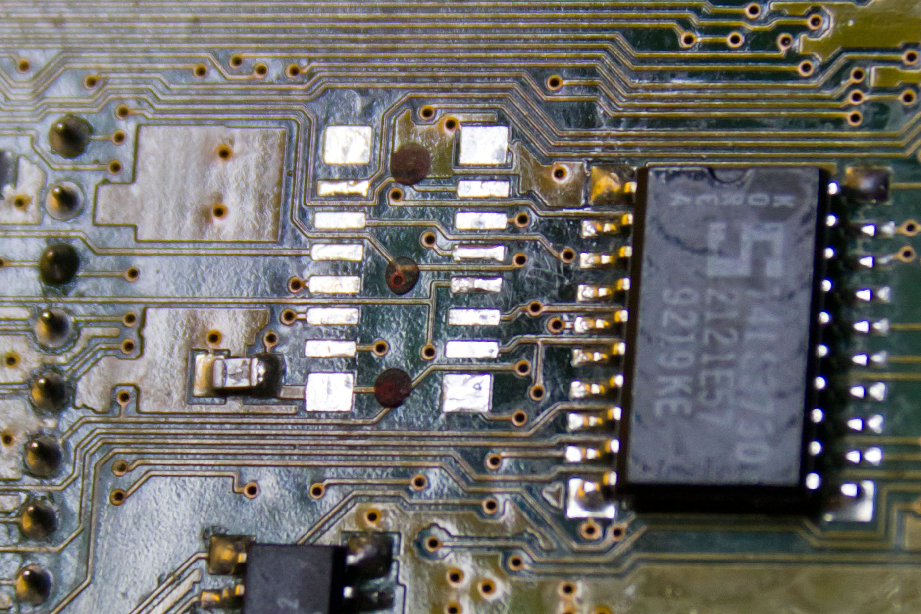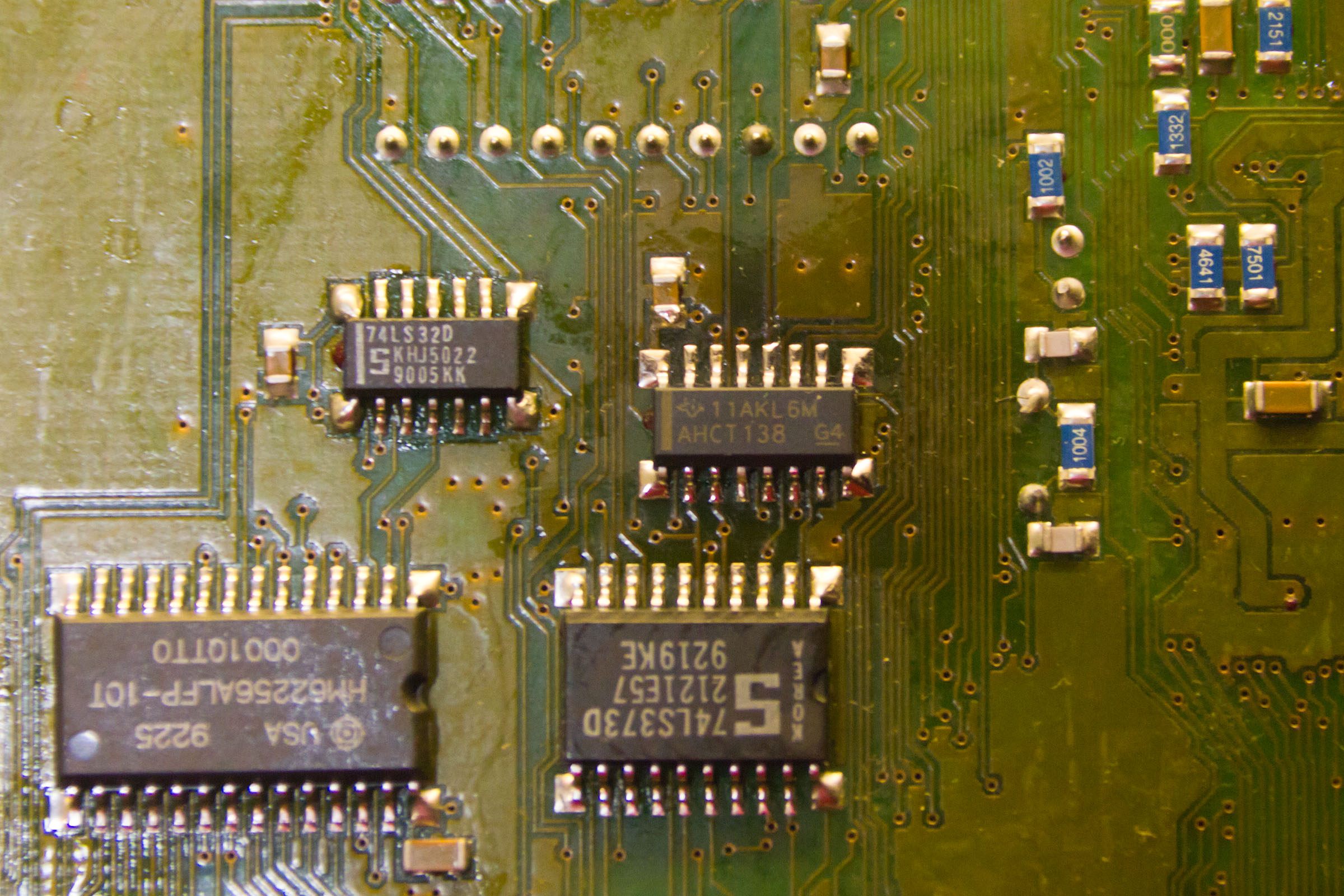 Actually debugging the signals is not all that feasible. For one thing the getting a probe to the rear of the card would be impossible. For another we're probably trying to capture just one event as the CPU card resets the front processor and tries to establish comms with it so the easiest way of debugging the fault is just to swap suspect parts and see what happens. I'll do the 74LS138 first as a) I happen to have a replacement handy and b) when I first got the CPU card out it was obvious that the 74LS32 has already been replaced.