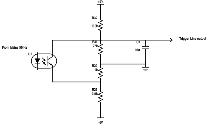 Pin 7 is for the line trigger. The problem must be on the power supply but I don't really understand how this signal can even reach 1,4 V pkpk or even 5 Vpkpk since it is made by a phototransistor and a resistor network derivated from the 5 VDC.