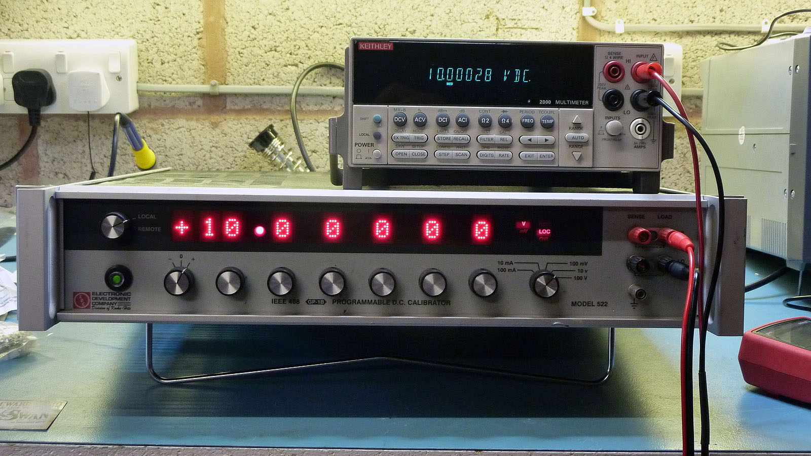 The Keithley's 1 year accuracy is 50ppm of reading plus 35ppm of range giving 85ppm at 10V (and this one hasn't been calibrated recently) so any reading from about 9.999V to 10.001V would be acceptable. Sadly the 522 is not quite accurate enough to check the Keithley and vice versa.