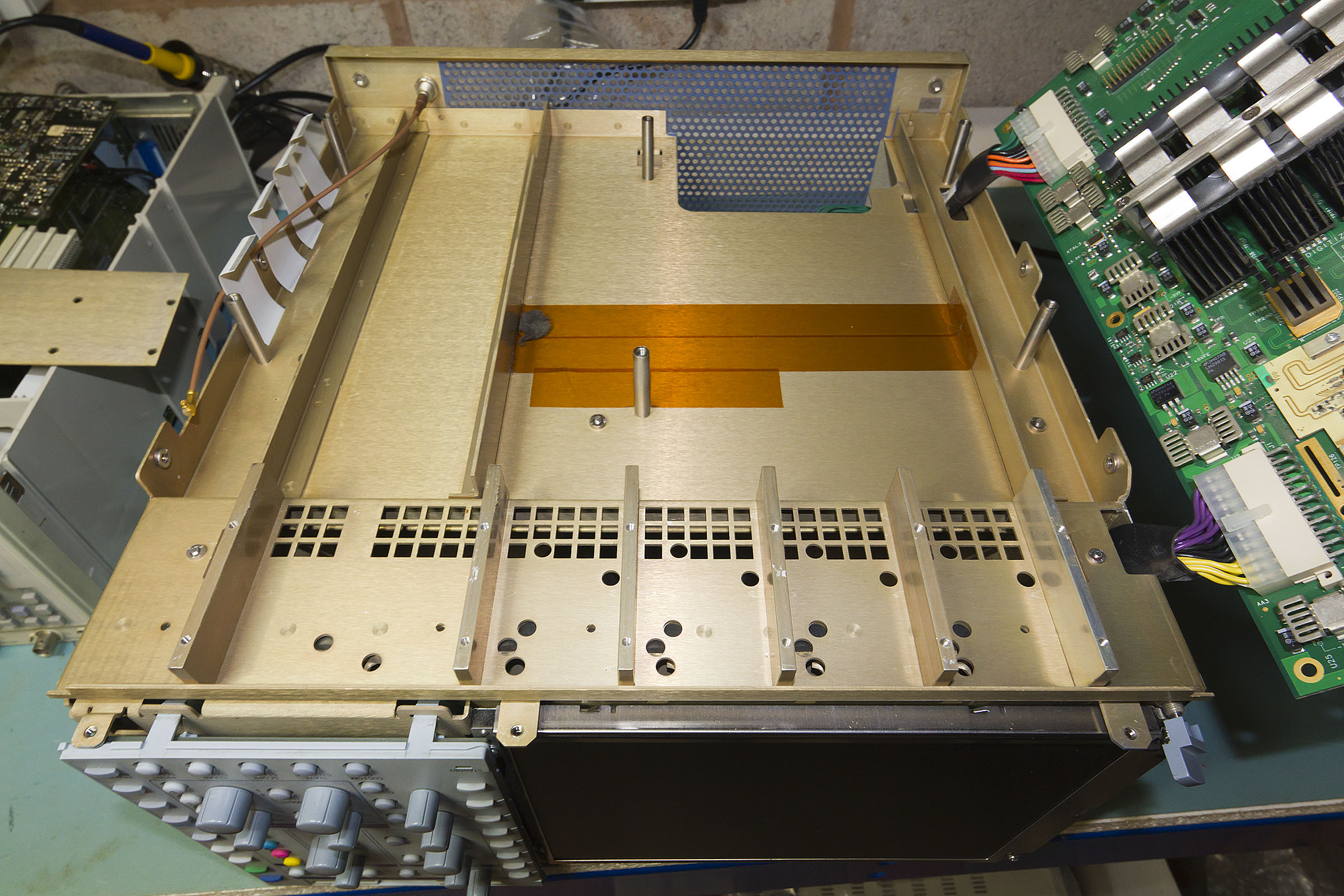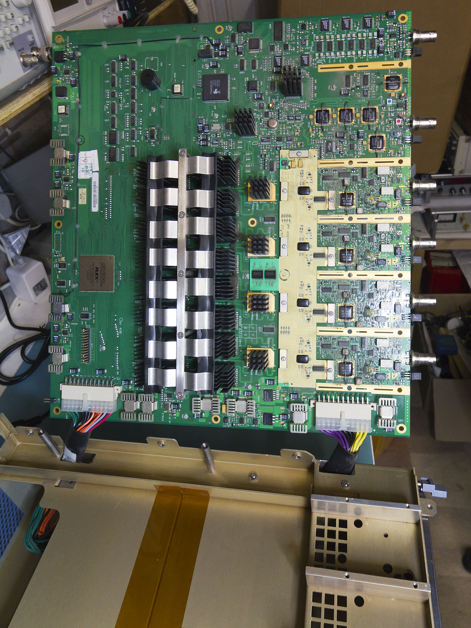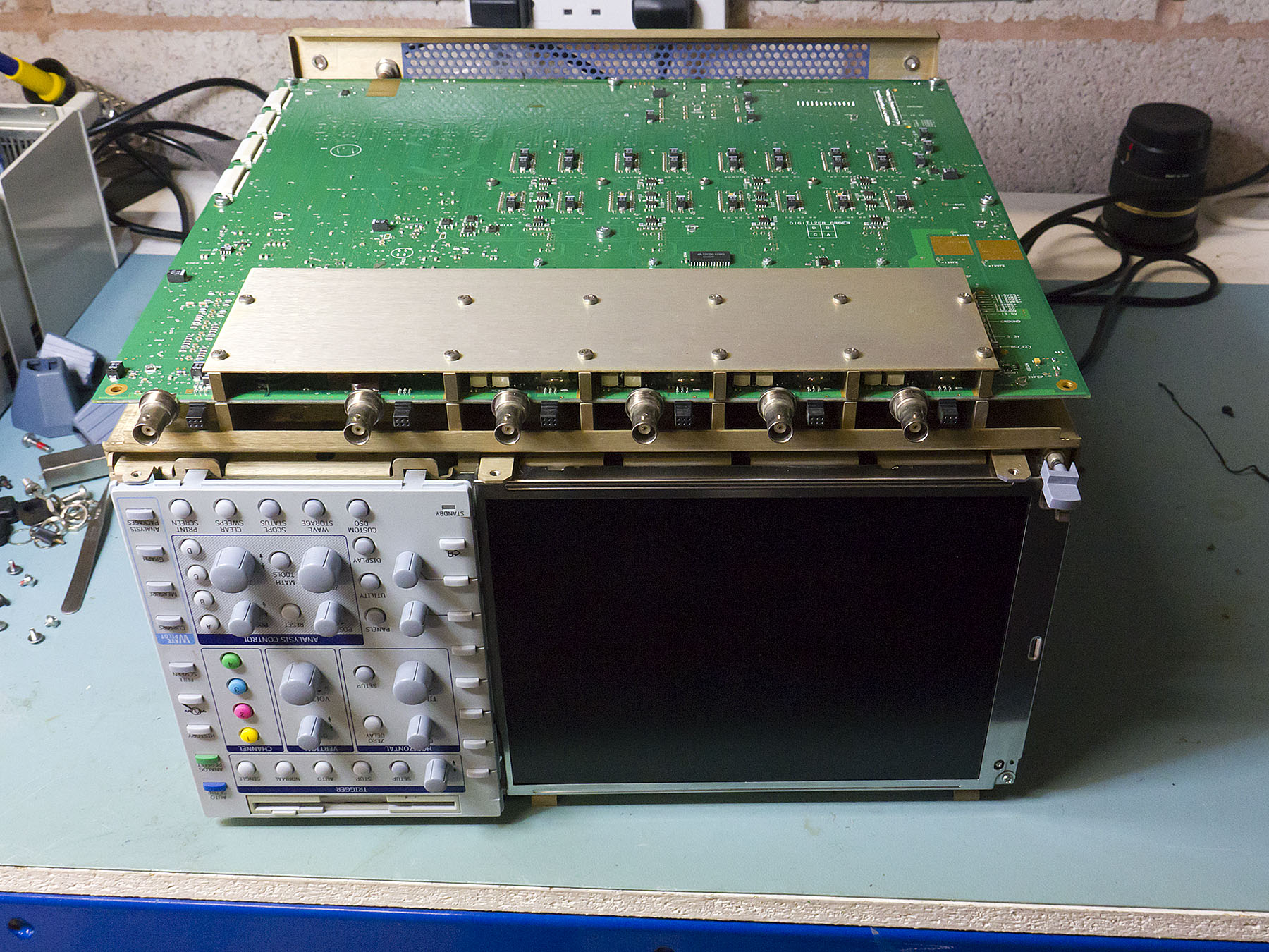 So, having had a look at the CPU let's flip the 'scope over and examine the business end of things. With the bottom cover off we can see the acquisition board - this side doesn't look all that exciting so the next step is to remove the screening - we need to do that to get the board out in any case.