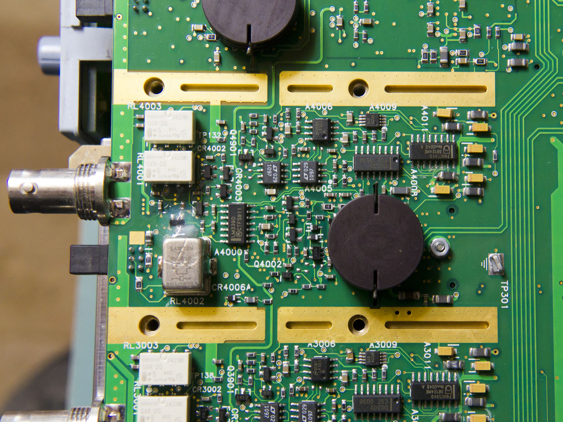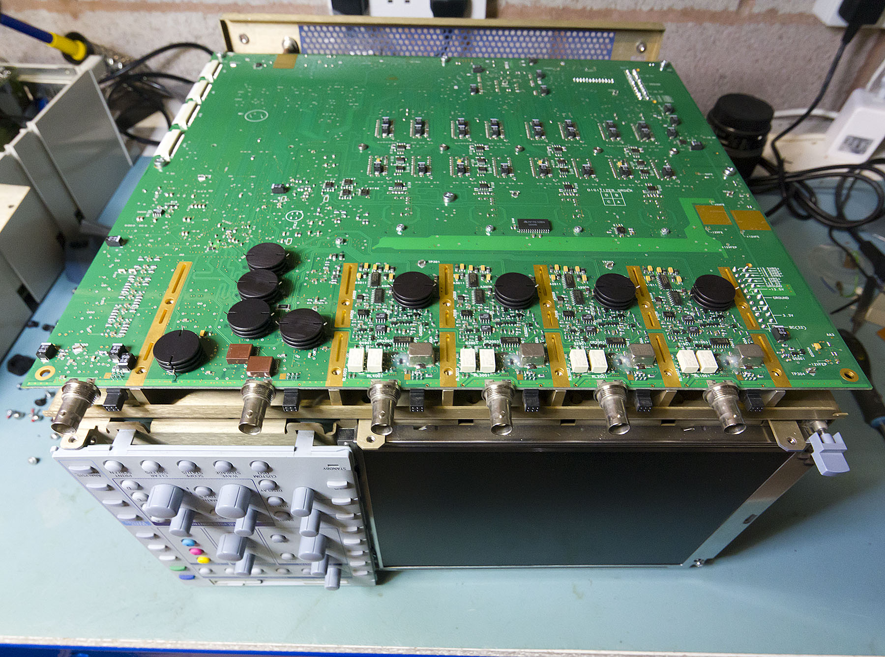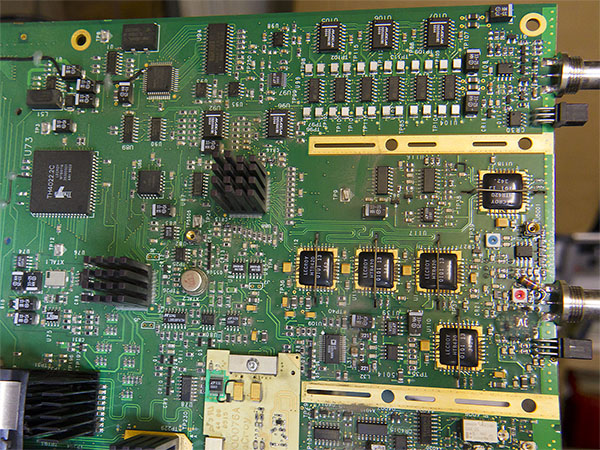 So, having had a look at the CPU let's flip the 'scope over and examine the business end of things. With the bottom cover off we can see the acquisition board - this side doesn't look all that exciting so the next step is to remove the screening - we need to do that to get the board out in any case.