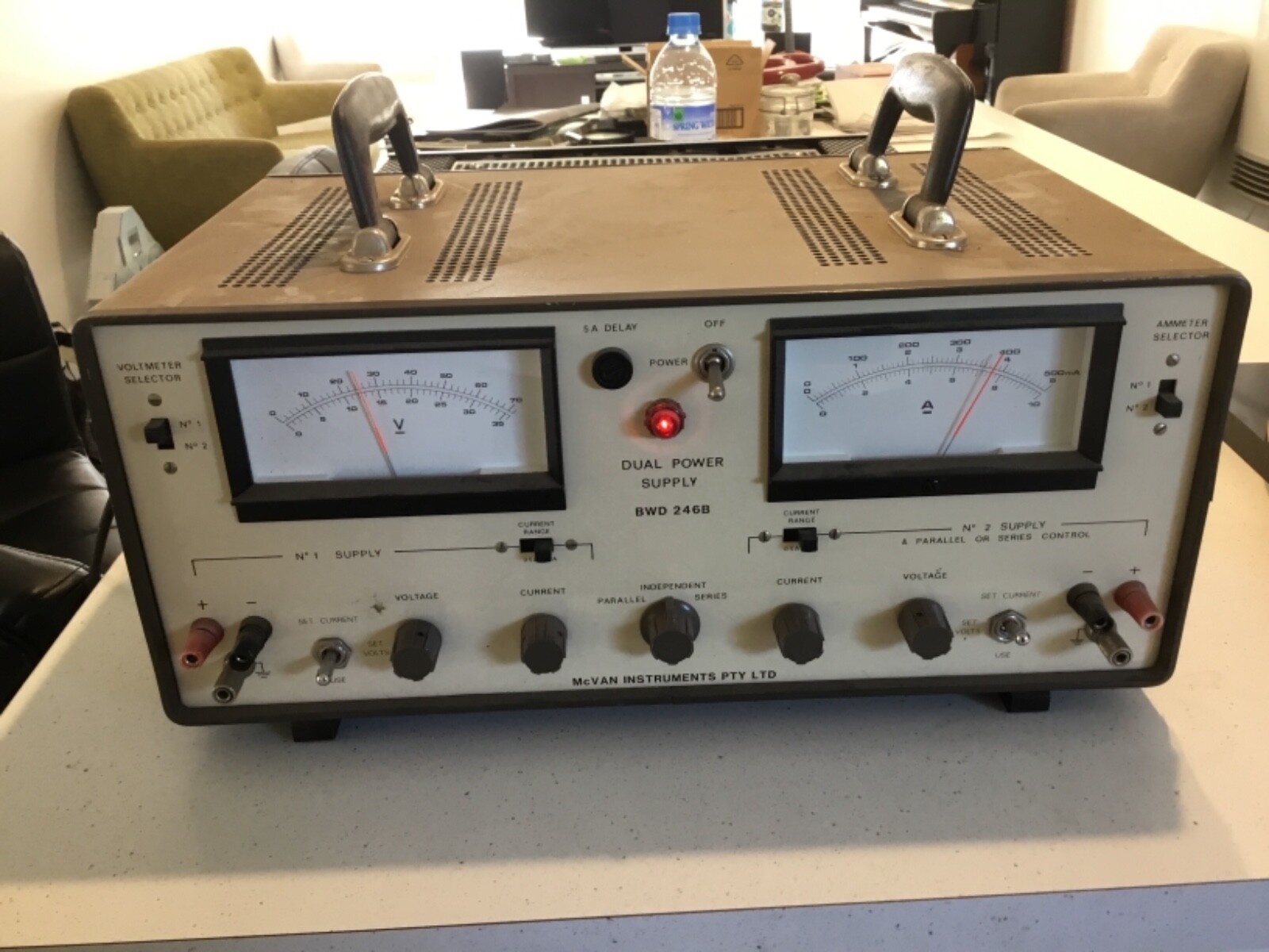 Added some slightly more serious Linear oomph to the bench with this 22kg beasty. Aussie made and tough as old boots. 35V @ 5A x 2. My couple of beefy SMPS can go back to just R/C use. $100 AU pesos plus 1/2 a truckload of $ for freight or maybe a 5 hour round trip to pick it up.
