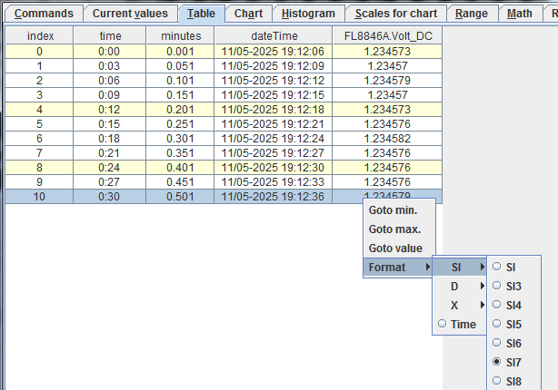 The table defaults to “SI7 format”, and all digits are displayed by default.