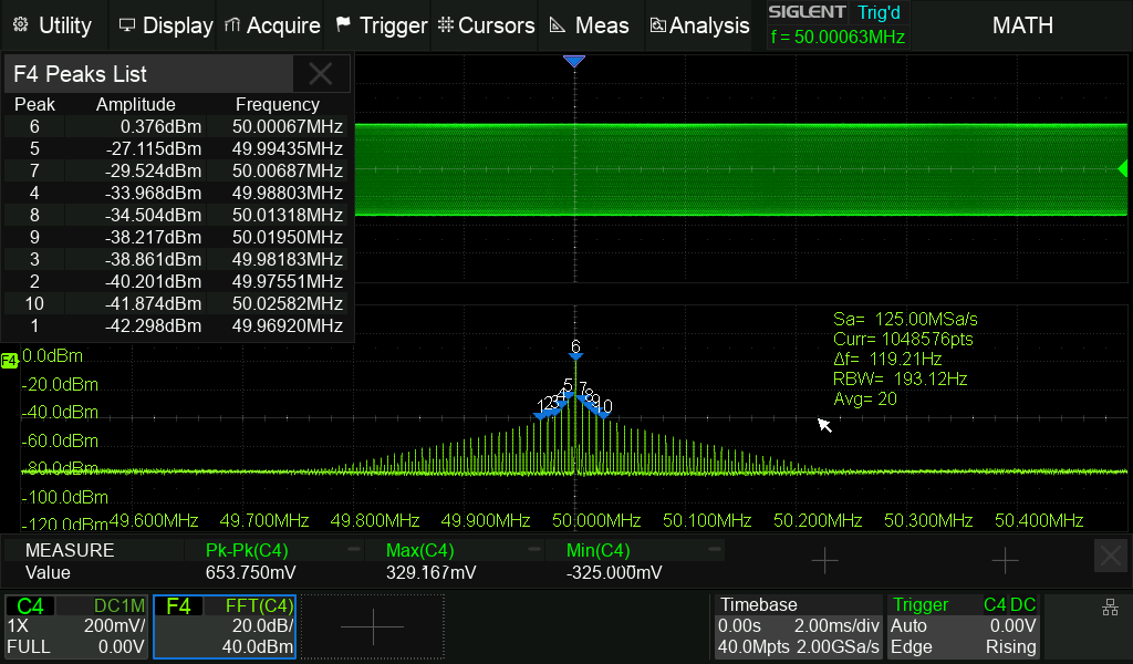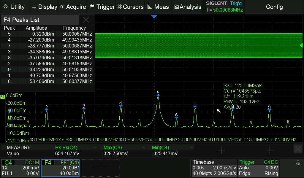 SDS824X HD_FFT_50MHz_0dBm_RBW200Hz