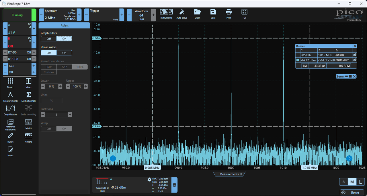 Yet we can try to come as close as possible: using the full 2 Mpts at 250 MSa/s we can get about 440 Hz RBW with the Flattop window. In a pinch we could use the Blackman window, which has still acceptable amplitude accuracy and a great side-lobe suppression. This way we can get ~200 Hz RBW: