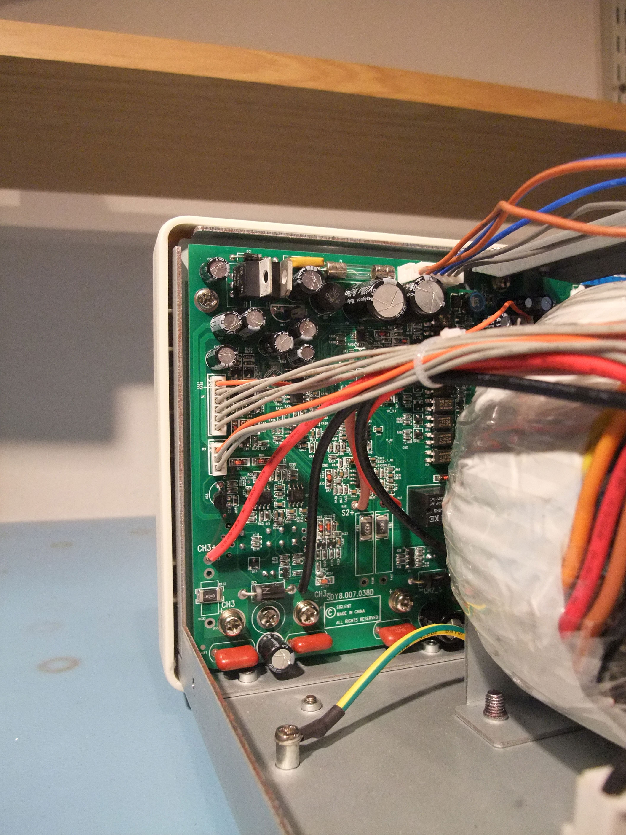 Just for comparing this with the other channels and to verify my measurements: same setup, but this time for channel 2 (8 ohm load, turned on). I shorted it momentary, as with the test for channel 3. As you can see, nice regulation without overshooting. Same for channel 1, no problems.