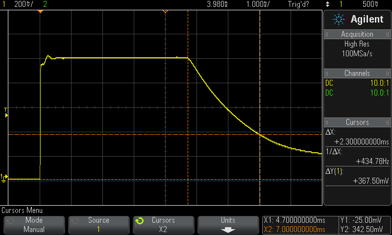Switching period is 2ms. 1A 1.7ms and 0.3ms 2A. It need note that switch turn on and off edges are quite fast (enough for this purpose)