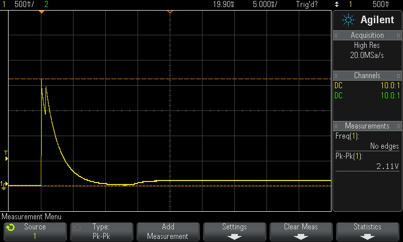 Load. Continuous 1A and load step to 2A, step duration 300us. Oscilloscope CH1 show switch control signal from Siglent SDG5082 to switch unit what control PSU load. Load is set of selectable power resistors)