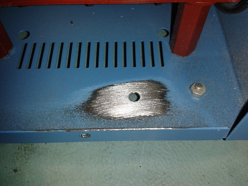 Now, to make an earth point, I drilled a hole in the bottom of the chassis through which an M4 bolt could pass. Then I removed the paint from the area with a small section of emery cloth.