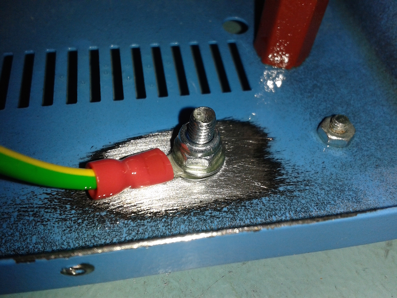Now, given that the main enclosure is of steel construction and the front panel is of aluminium, I decided that galvanism may contribute to an unreliable connection at the interface of the two metals. In addition, the two are only joined by a few self tapping screws, which provide durable construction, but an electrical connection may, again, be unreliable.