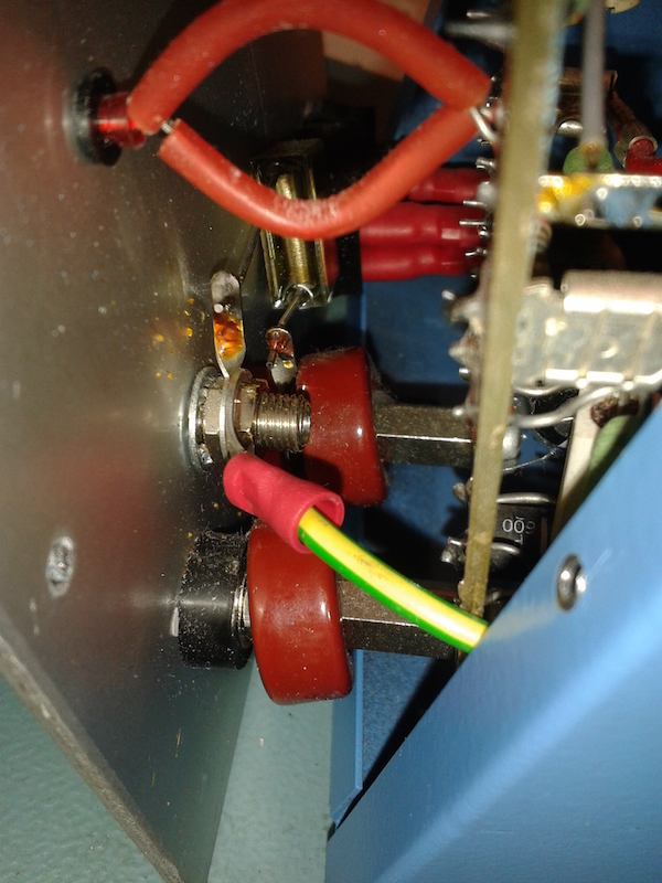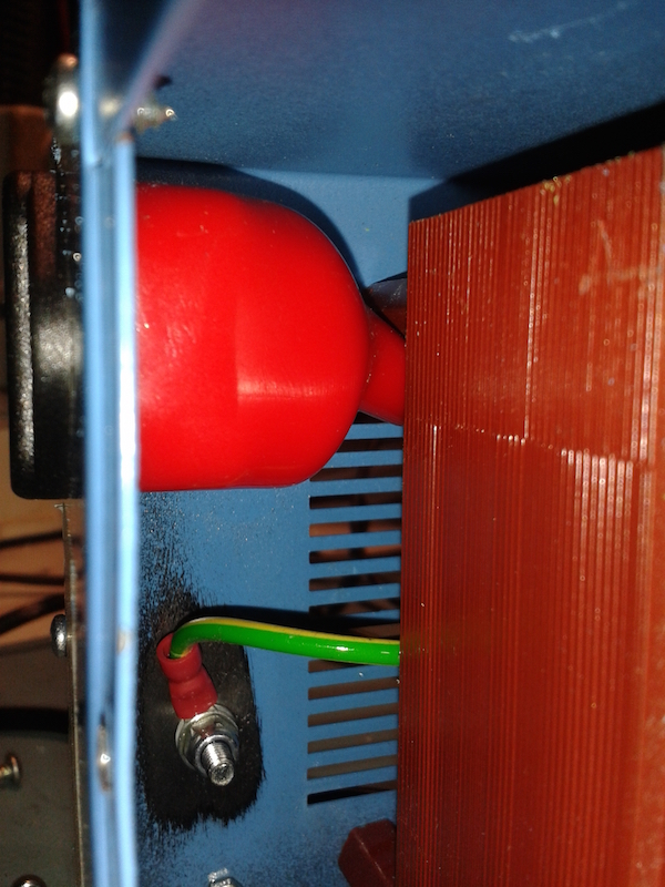 Now, one of the earth wires from the C14 connector is terminated in a crimp terminal and bolted firmly down with a nylock nut and an internal star washer between the case and the terminal. Once fastened, I sprayed a layer of clear lacquer to prevent corrosion from compromising the connection.