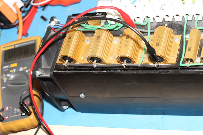 Now for some good old load tests. Behold, the load bank. In the below images I have actually overloaded the power supply with a 4? load with the voltage adjustments at their highest settings. You can see that it is in constant current mode passing close to 7A. This sort of condition did cause the current to drop rather steadily as you can see, in the time it took to take a photograph of the resistor bank, the current displayed on the multimeter (and indeed the PSU ammeter) had reduced. There is nothing to worry about here as this is an overload condition. Although the particular resistor array arrangement was only worth about 120W, it had not heated up enough to cause that much of a drop in current. The heatsink to which the resistors are mounted is massive.