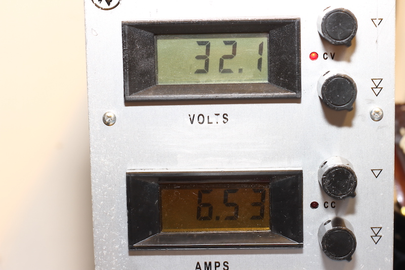 What about operating the PSU within the constraints of it's advertised specifications. Crazy though such a proposition may seem, I thought I'd re-arrange my resistor bank in such a way as to present a 5? load to the PSU. A 5? load would drive the PSU to the brink of it's advertised limit at 32V. Indeed, 6.4A should flow and it does. Again, at this point my resistor bank is overloaded (two 10? 75W resistors in parallel). The mass of the heatsink is keeping the resistors from melting (or even warming up for that matter).