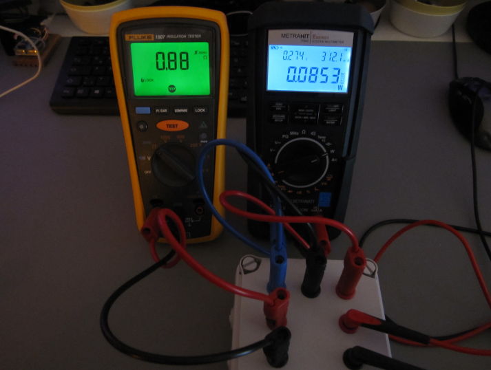 The Metratester 5+ (the black power outlet is only for testing purposes without mains, the white is with mains)